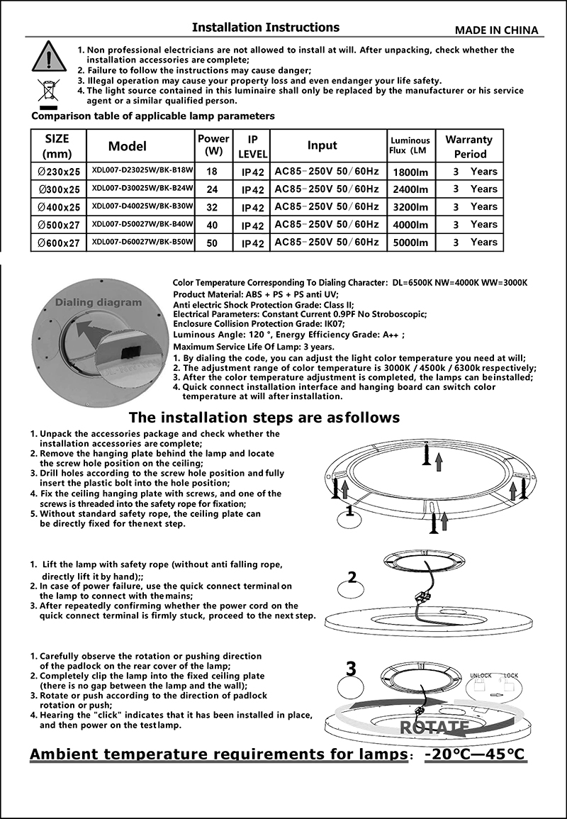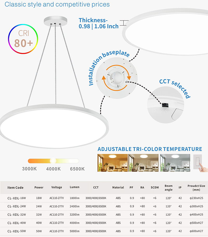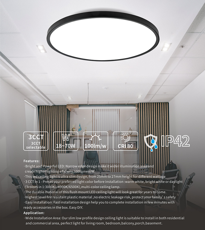 4.Lamp body materlal: ABS +pmma/ps Anti yellowing5.Color temperature can be adjusted 3000K/4000K/6000K6.No stroboscopic,no eye damage7.Two installation methods: ceiling installation and hoisting